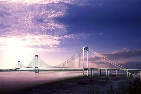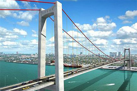 馬普托大橋?yàn)榈劐^式懸索橋,主橋跨徑680米,橋塔采用門(mén)式構(gòu)造。...