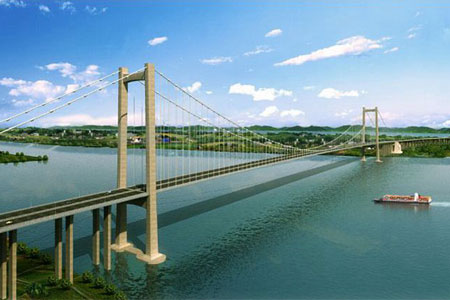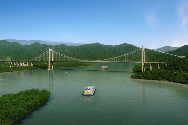 大沙水道橋?yàn)橹骺?200米雙塔單跨鋼箱梁懸索橋。...