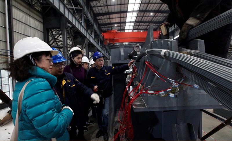 除索鞍索夾制造外,天元公司還承擔(dān)了陽寶山特大橋錨固系統(tǒng)研發(fā)及供應(yīng)、AS法的科研課題以及上部結(jié)構(gòu)施工等任務(wù)。驗(yàn)收組領(lǐng)導(dǎo)一行檢查了天元公司科研試驗(yàn)現(xiàn)場(chǎng),并細(xì)致了解科研試驗(yàn)開展情況,對(duì)于科研課題的順利開展,驗(yàn)收組領(lǐng)導(dǎo)給予了高度的評(píng)價(jià)。