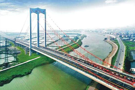 杭州江東大橋又稱錢江九橋,大橋全長4332.5米,大橋設(shè)計新穎,其中三跨空間纜自...